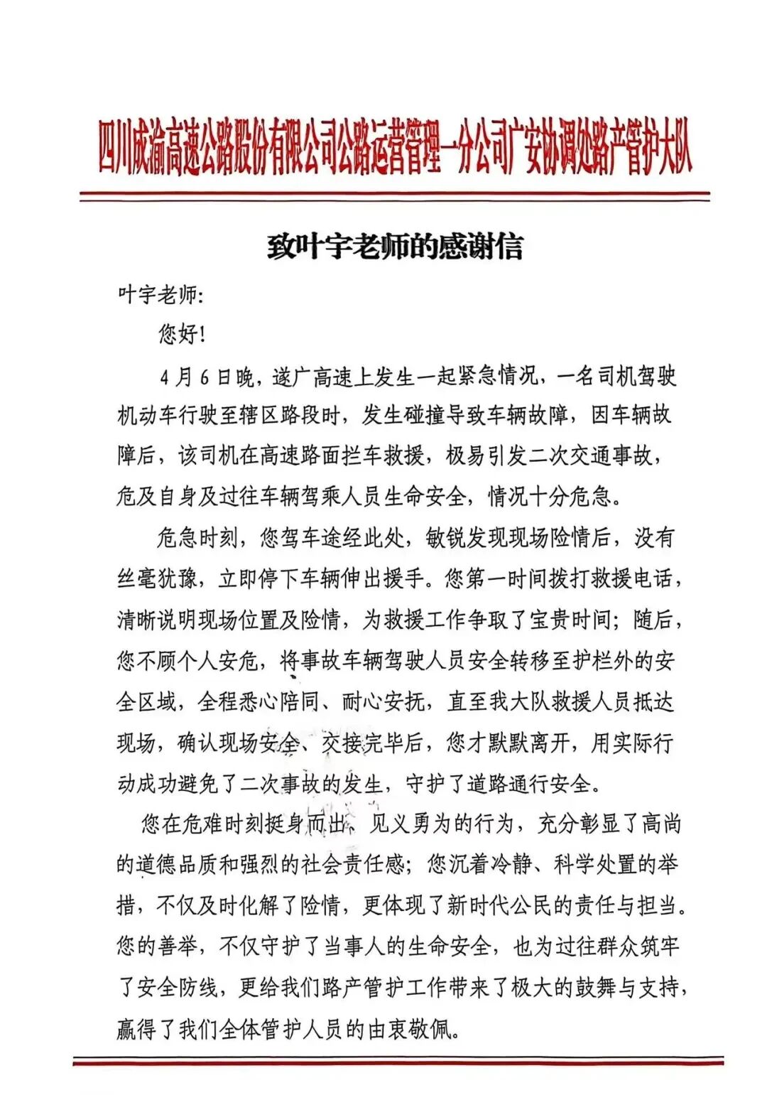 而更让他没想到的是,四川成渝高速公路股份有限公司公路运营管理一分公司广安协调处路产管护大队还专门送来了感谢信。