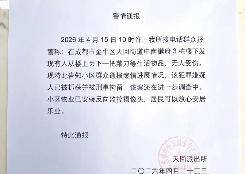 4月23日,成都市公安局金牛区公安分局天回派出所发布警情通报称,4月15日10时许,该所接群众报警称,在中南樾府小区3栋楼下发现有人从楼上丢下菜刀等生活物品,无人受伤。现特此告知小区群众案情进展情况,久久99精品国产99久久该犯罪嫌疑人已被抓获并被刑事拘留,该案还在进一步调查中。小区物业已安装反向监控摄像头。
